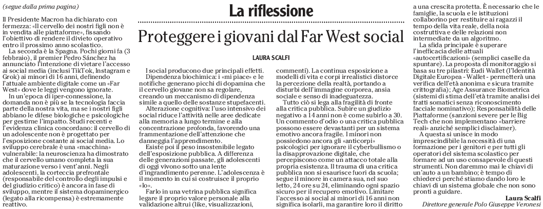 Limitare l’accesso ai social ai minori di 16 anni non significa isolarli, ma garantire loro il diritto a una crescita protetta. È necessario che le famiglie, la scuola e le istituzioni collaborino per restituire ai ragazzi il tempo della vita reale, della noia costruttiva e delle relazioni non intermediate da un algoritmo.